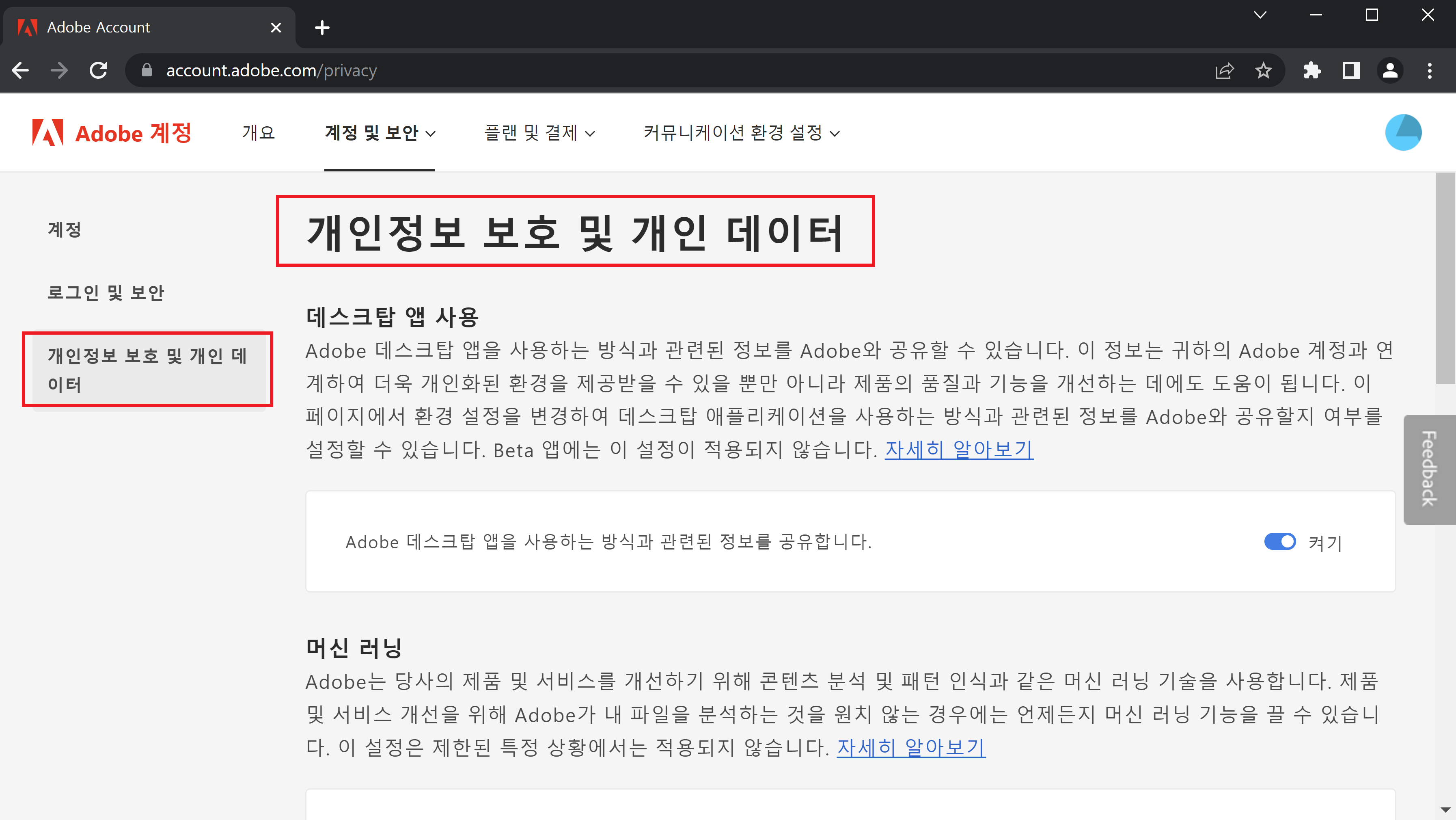 2. 상단 메뉴 중 '계정 및 보안> 개인 정보 보호 및 개인 데이터'로 이동합니다.